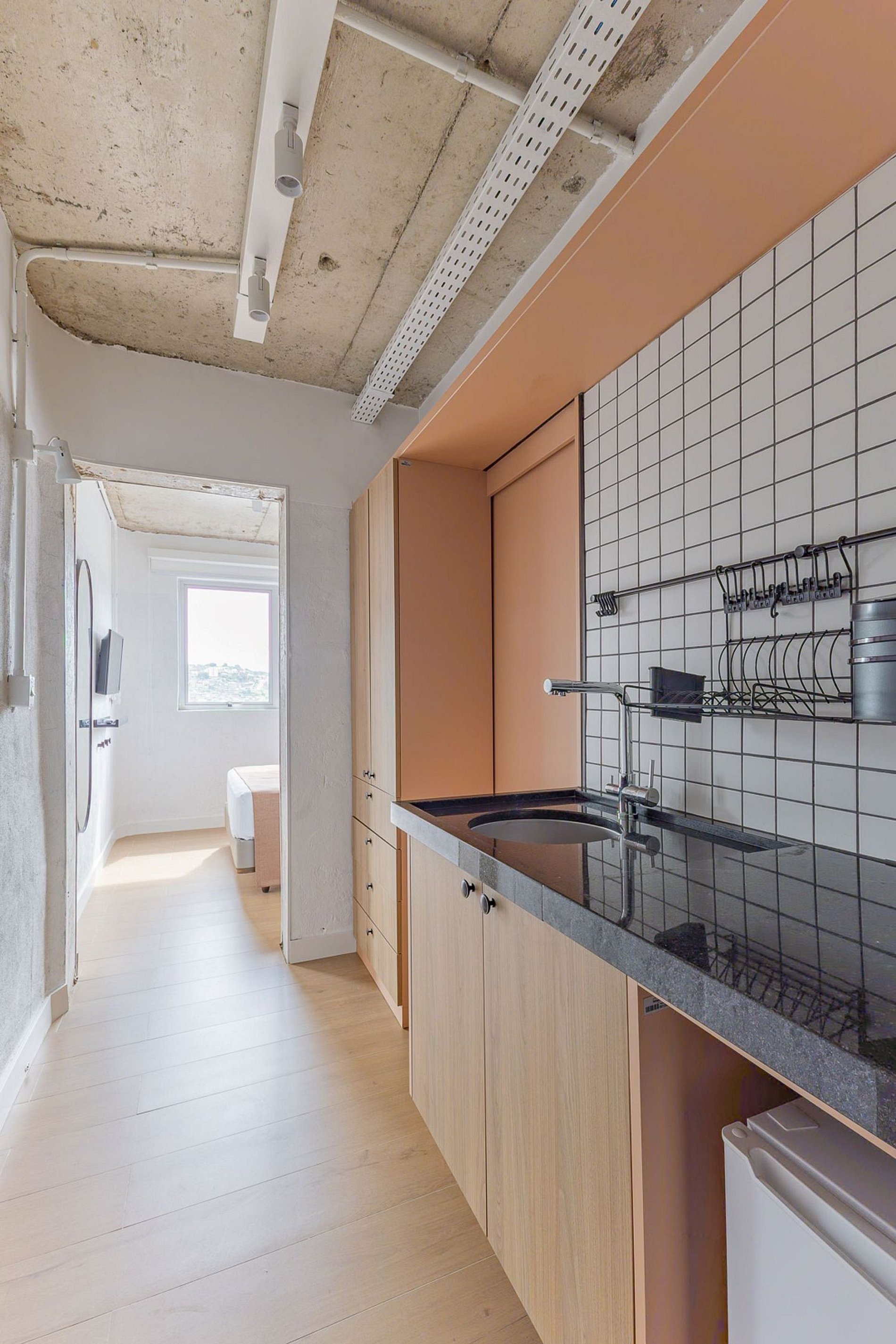 Projetado para estadias curtas, esse apartamento oferece um banheiro completo, uma cozinha bem equipada e uma área de descanso que inclui cama, espaço de armazenamento e uma pequena mesa multifuncional para apoio, estudo, refeições e atividades similares.